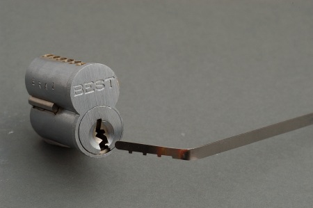 The two shear lines can make SFIC locks difficult to manipulate (pick) with conventional tools, because the attacker will usually set some of the pin stacks at the operating shear line and others at the control shear line (which means that even though all of the pins appear to be set, the lock will not operate). In fact, assuming randomly distributed keys, equal friction on the plug and control sleeve, and no mastering, a six pin core with all pins set will only actually open an average of one out of 64 times, and a seven pin core only one out of 128 times. (In practice, it is a bit easier, because unequal friction between the control sleeve and the plug tends to transfer torque more to one shear line than the other. Also, TPP mastering of the operating keyspace means that a given pin is twice as likely to set at the operating shear line than the control shear line). Compounding the difficulty are the small and heavily warded keyways and the tight manufacturing tolerances. Somewhat surprisingly, spool, serrated, and other "security" pin designs are not typically used (though Best now offers them as an option).